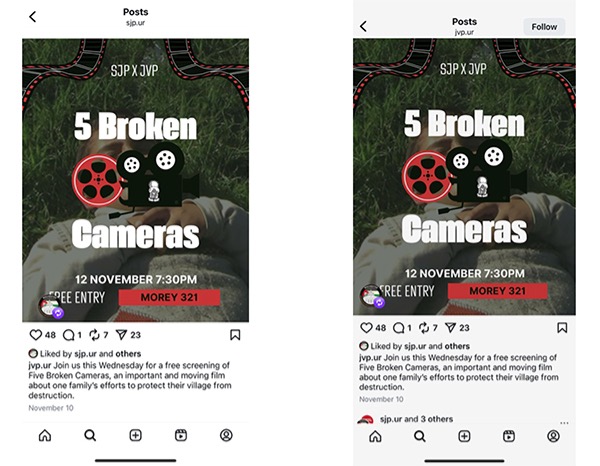 At the University of Rochester, where the SJP chapter was "derecognized" in February 2023, but still operates with seeming impunity, JVP enables the outlaw SJP to participate in campus events. As recently as November 12, 2025, the university's recognized JVP chapter and its derecognized SJP chapter jointly held a screening of a film titled 5 Broken Cameras. The two Instagram accounts (SJP.UR and JVP.UR) posted identical messages on November 10, under the heading "SJP X JVP."
